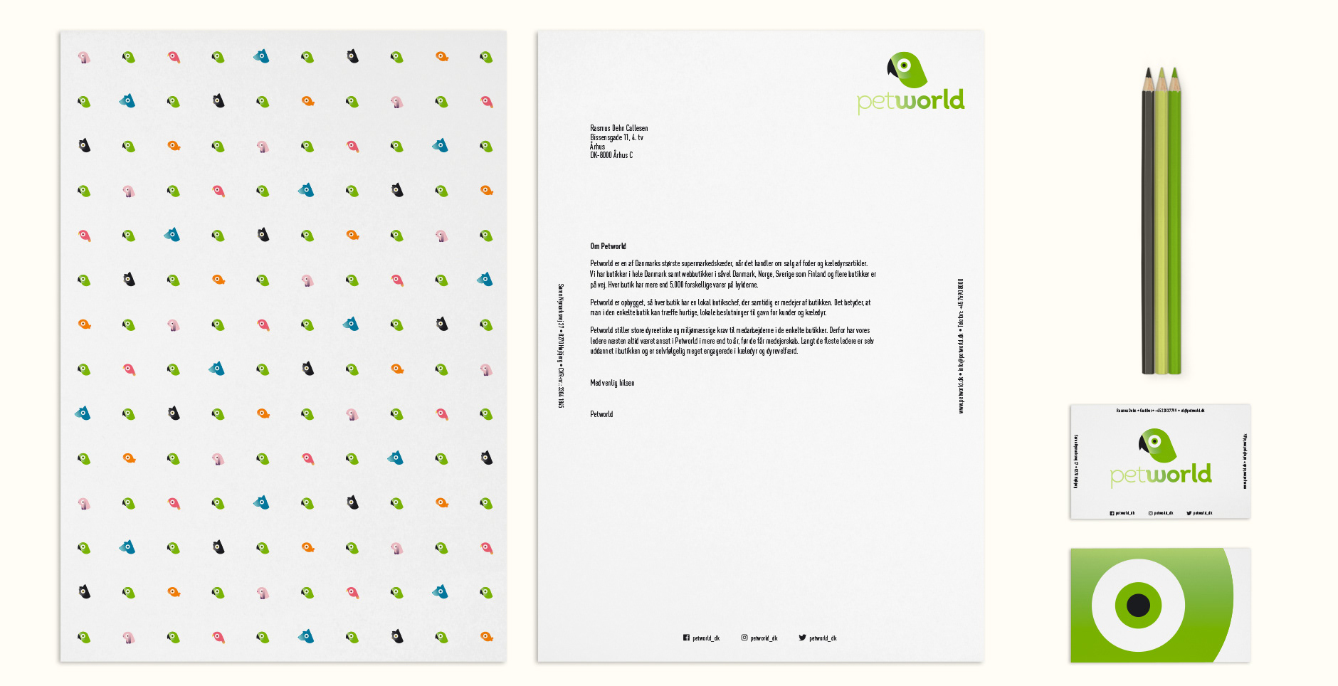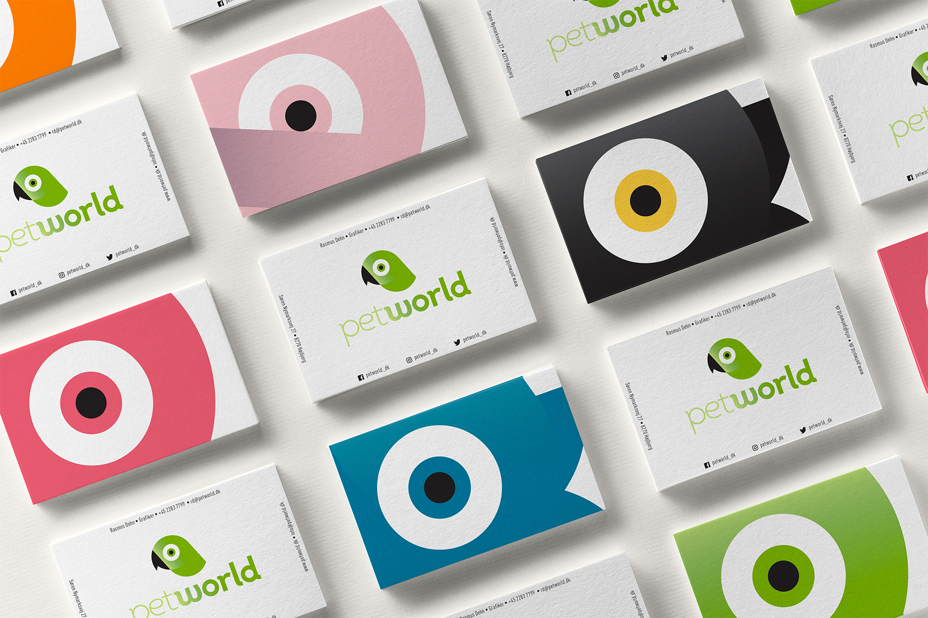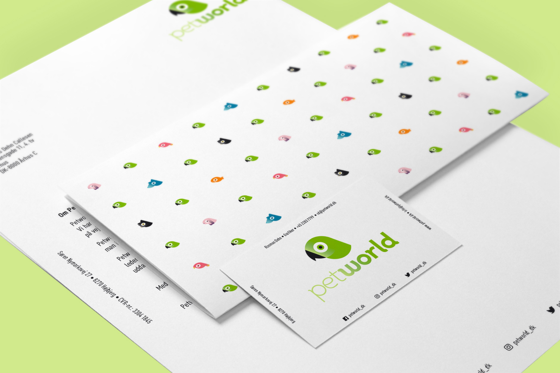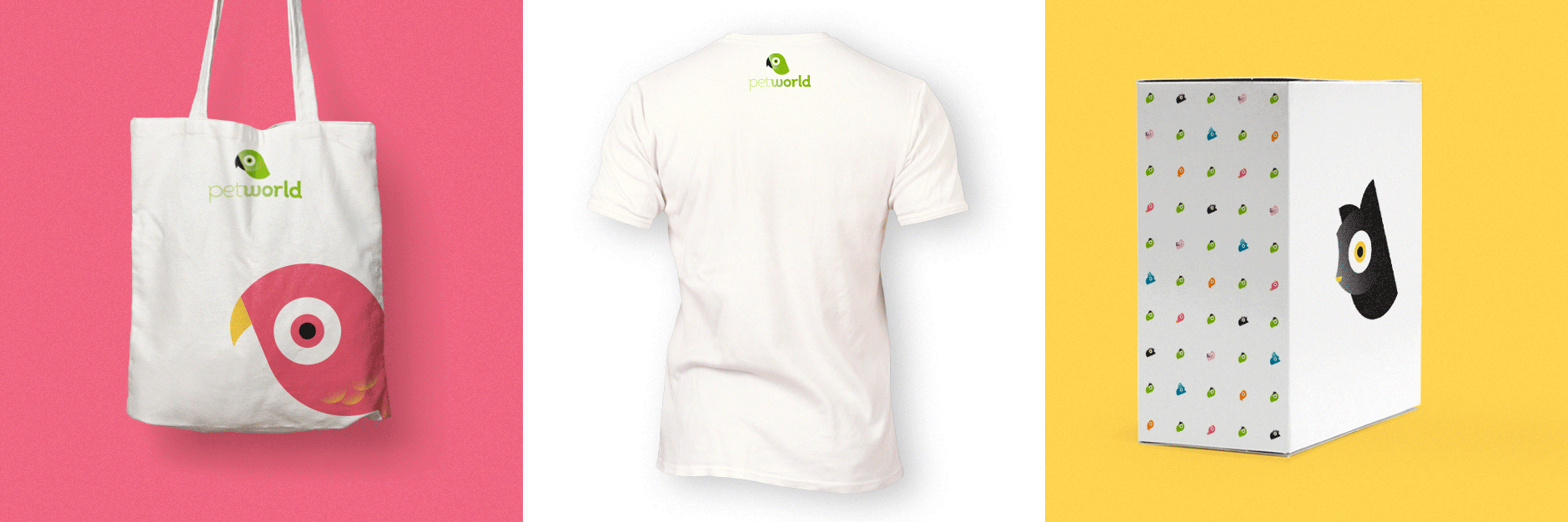 New logo and visual identity for Petworld – a Danish pet store chain. The identity includes stationery, colour palette, shopping bags, coffee mugs, tote bags, packaging and t-shirts.